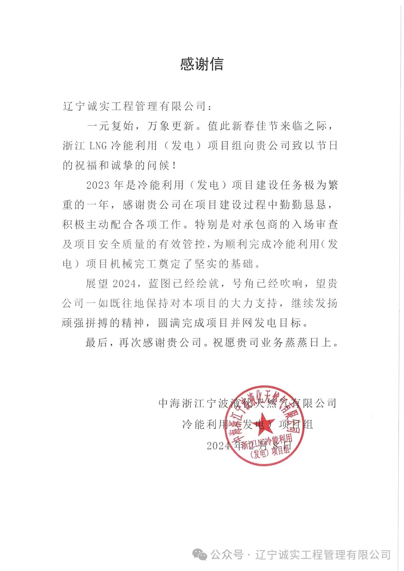 浙江LNG冷能利用(發(fā)電)項(xiàng)目組向公司發(fā)來(lái)了感謝信,信中肯定了公司項(xiàng)目部人員在2023年的努力,特別是對(duì)于承包商入場(chǎng)審查及項(xiàng)目安全質(zhì)量的有效管控,為項(xiàng)目機(jī)械完工奠定了堅(jiān)實(shí)的基礎(chǔ)。該項(xiàng)目是積極響應(yīng)國(guó)家及浙江省“十四五”規(guī)劃的節(jié)能減排政策,落實(shí)“綠色低碳”發(fā)展戰(zhàn)略的示范項(xiàng)目,項(xiàng)目投產(chǎn)后,預(yù)計(jì)年凈發(fā)電量約為2408萬(wàn)度,節(jié)省標(biāo)準(zhǔn)煤超3000tce,年減少CO₂排放可達(dá)18000多噸。展望2024年,項(xiàng)目部在黃思敏總監(jiān)的帶領(lǐng)下,將認(rèn)真執(zhí)行監(jiān)理職責(zé),積極推進(jìn)項(xiàng)目建設(shè),爭(zhēng)取項(xiàng)目早日建成投產(chǎn)。