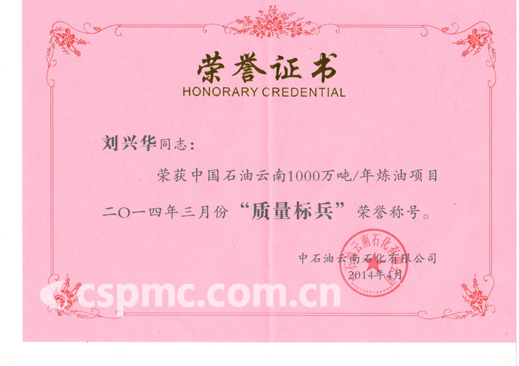 熱烈祝賀劉興華同志榮獲中國石油云南1000萬噸/年煉油項目2014年3月份“質(zhì)量標(biāo)兵”榮譽稱號!
