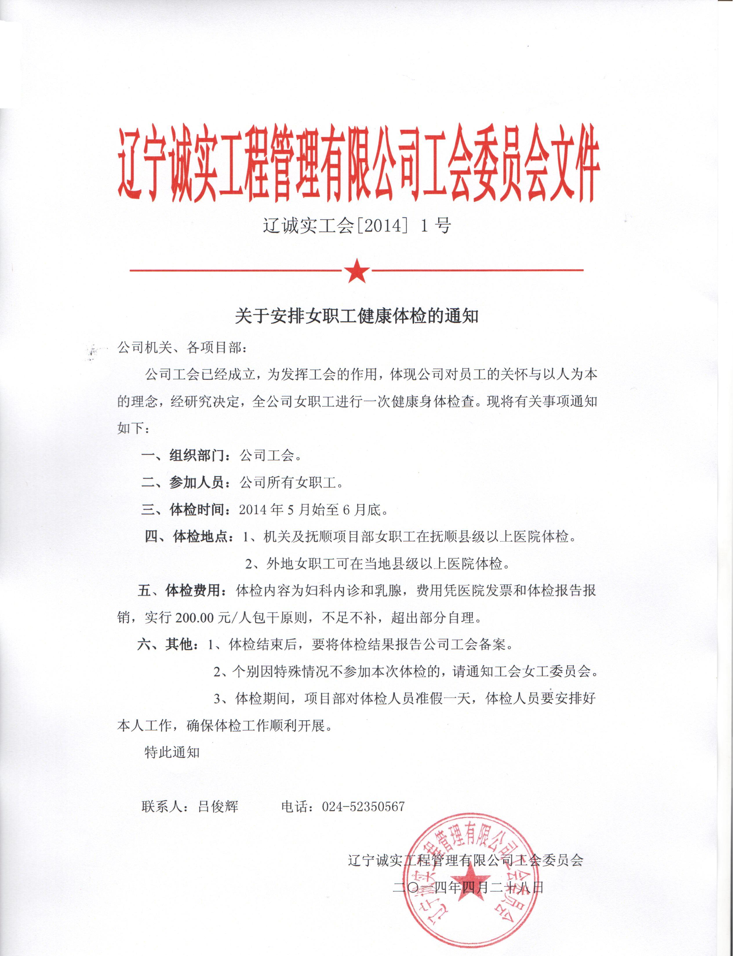 誠實(shí)工會(huì)將組織全體女職工于2014年5月底至6月底期間進(jìn)行健康體檢